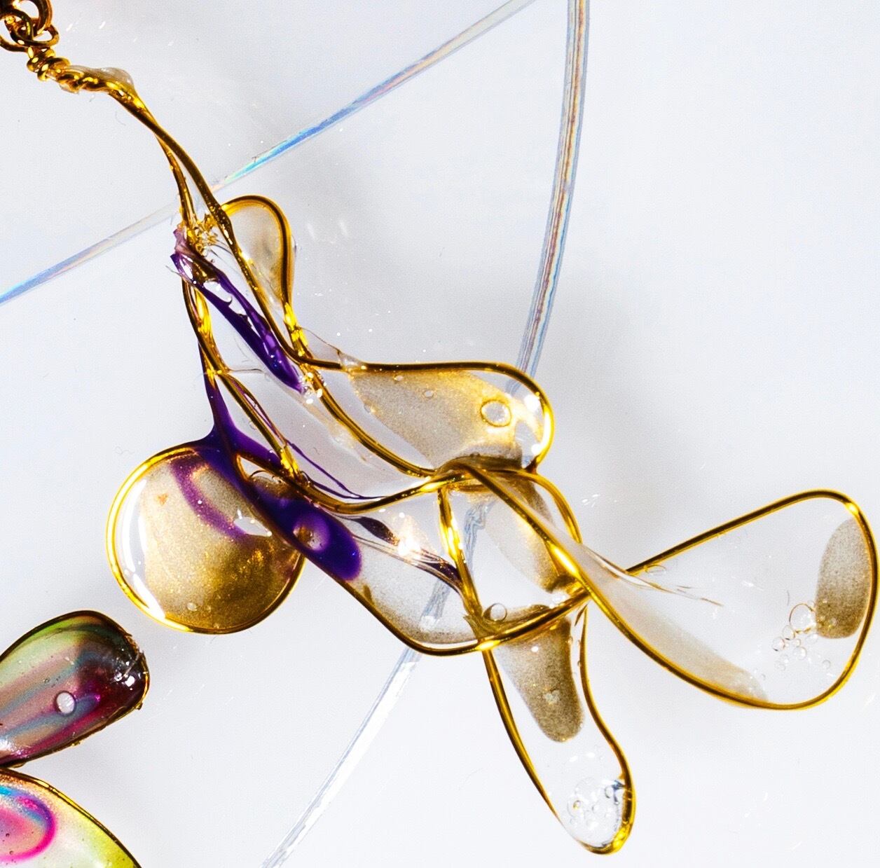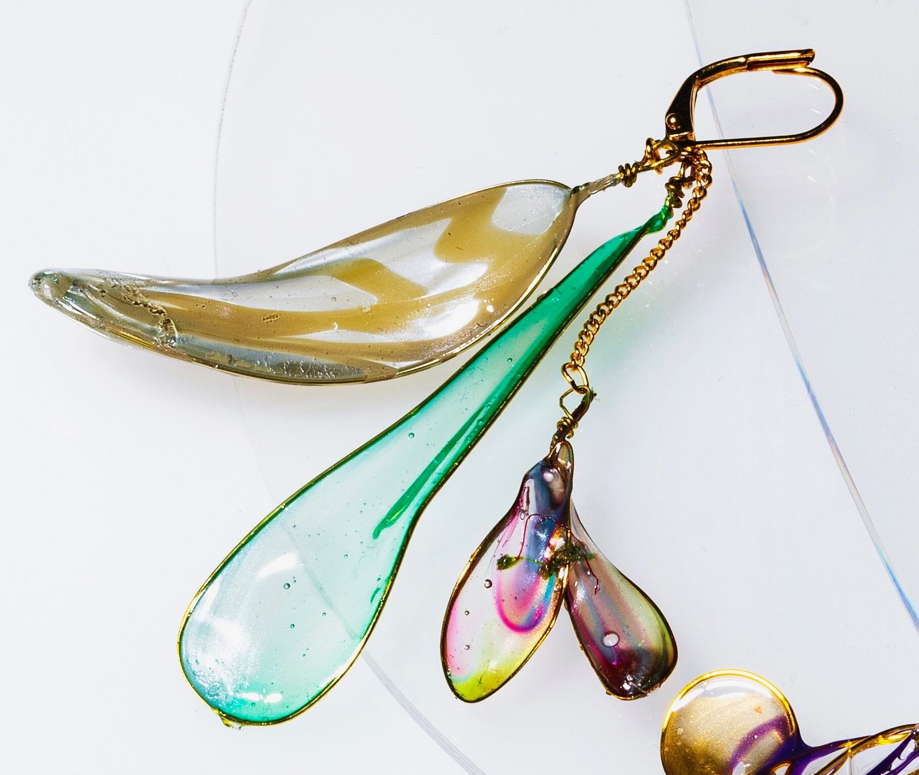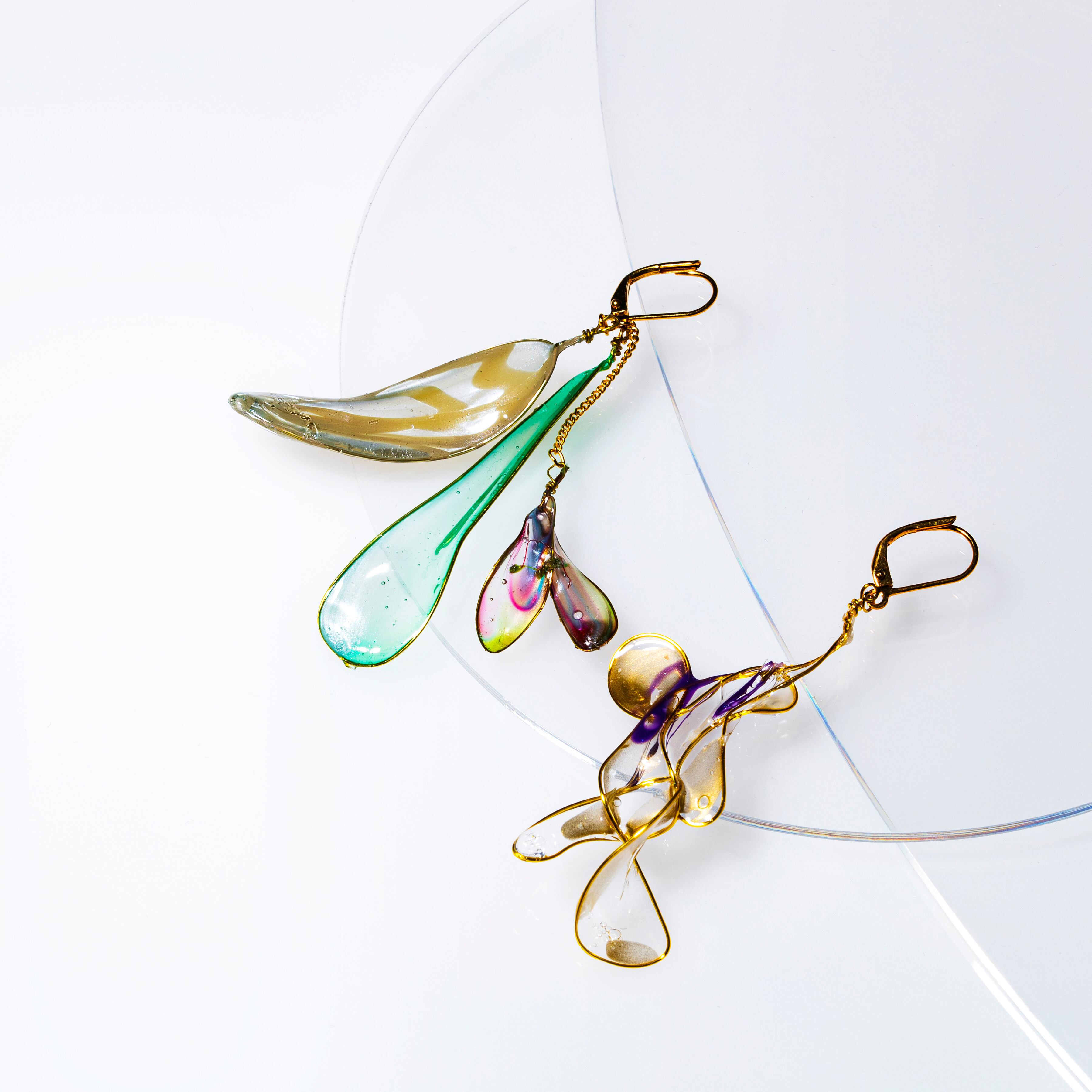 注意:耐水性ですが、繊細な作品になります。また素材の性質上、保管状態によってはピース同士がお互いにくっ付いたり、透明度が落ちたりいたします。またお好きなタイプの金具に変更も可能です。