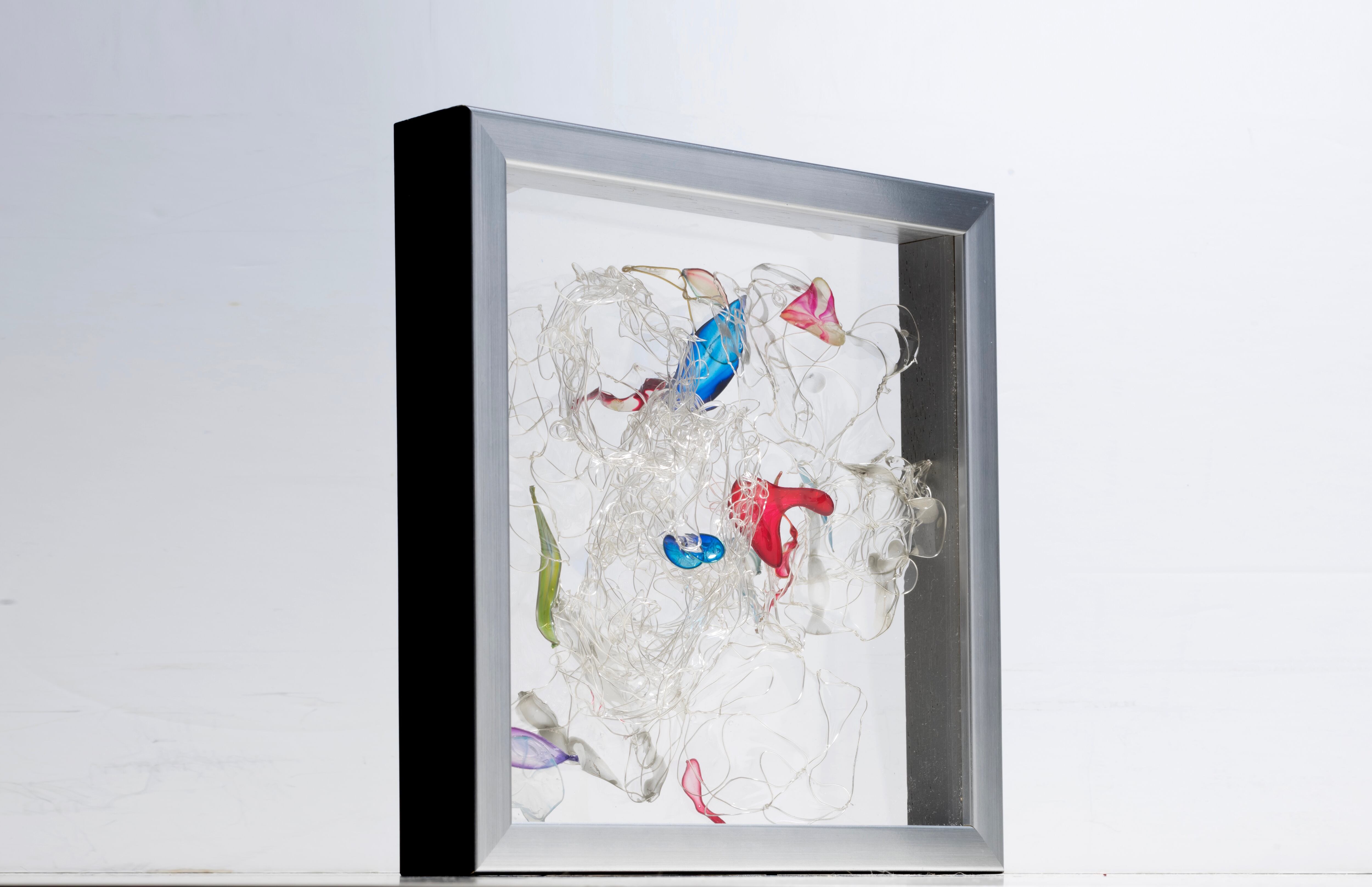 鮮やかで透明な樹脂とワイヤーを組み合わせた独自のアート作品。