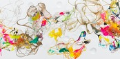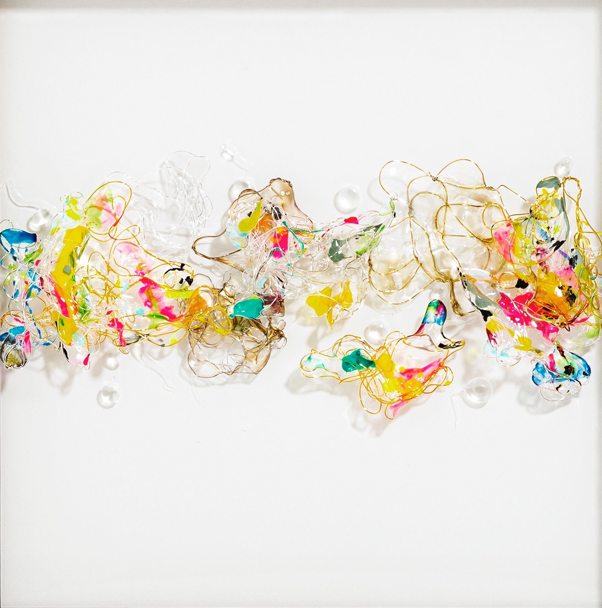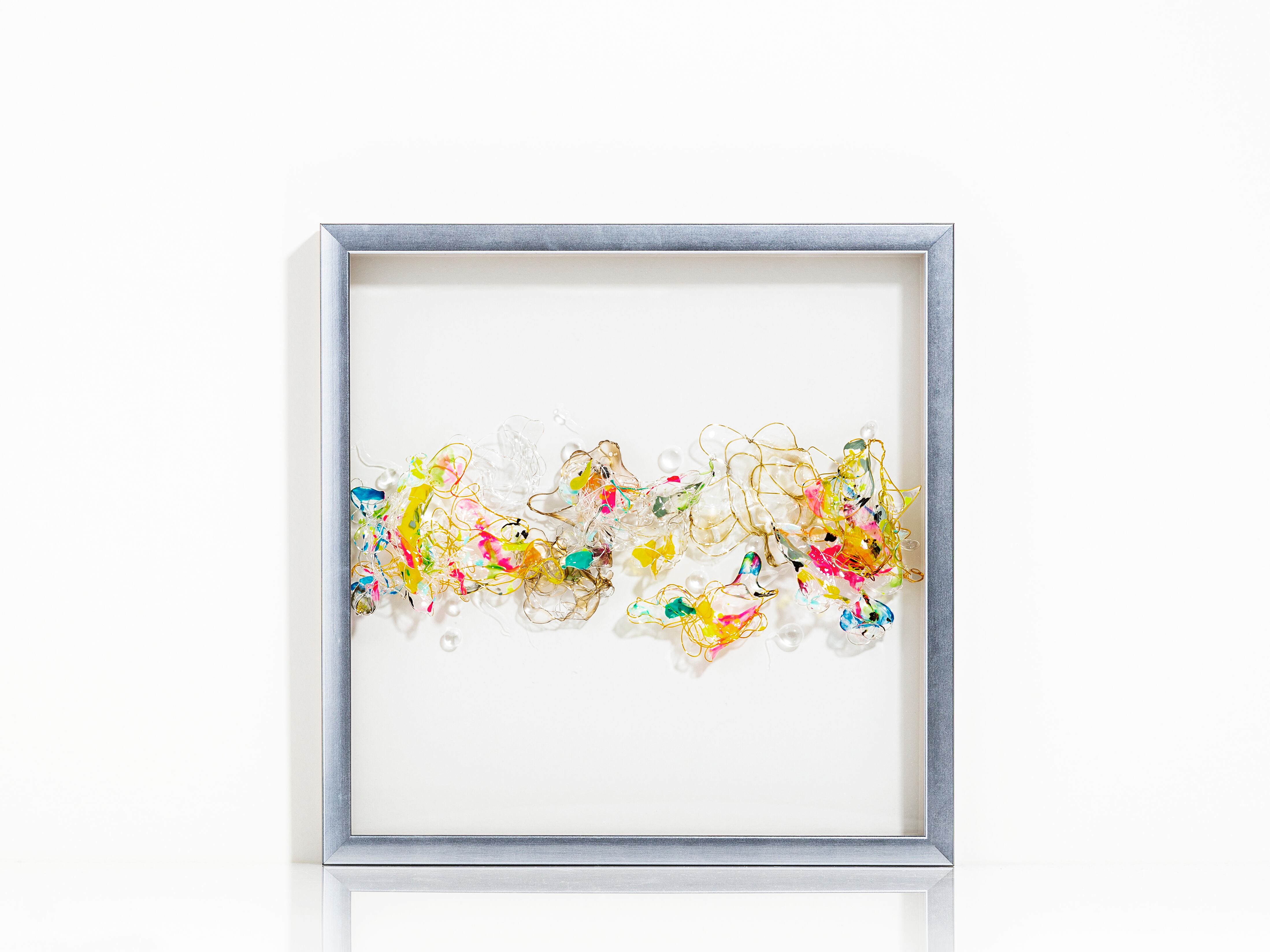 鮮やかで透明な樹脂とワイヤーを組み合わせた独自のアート作品。