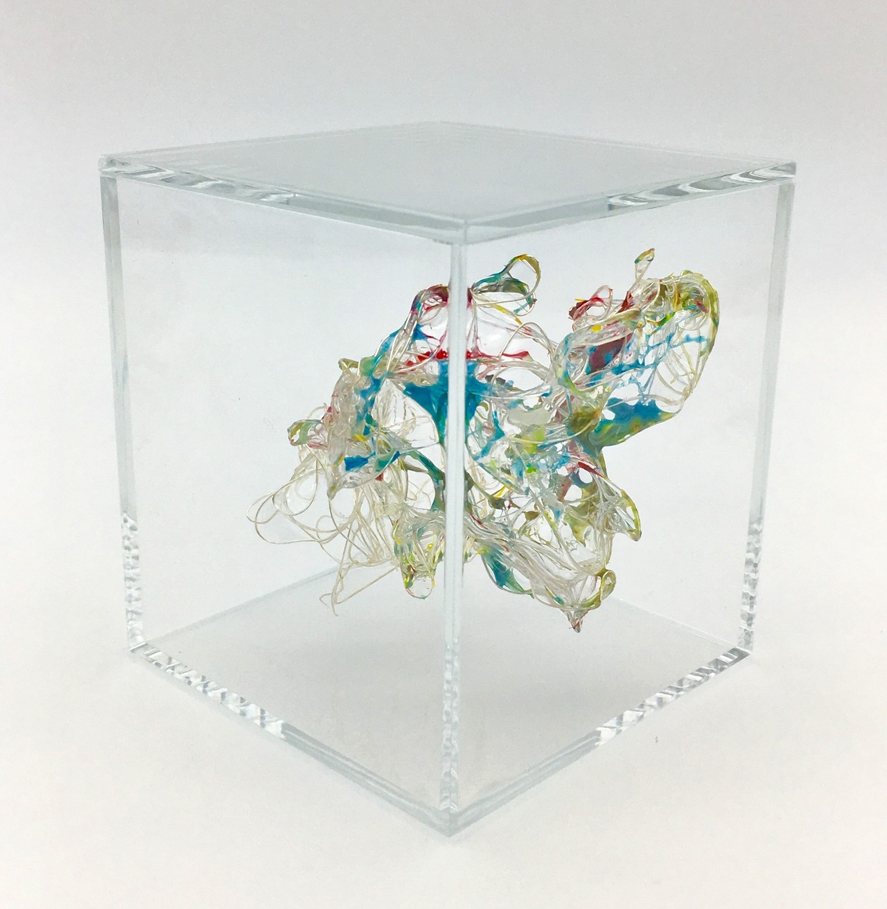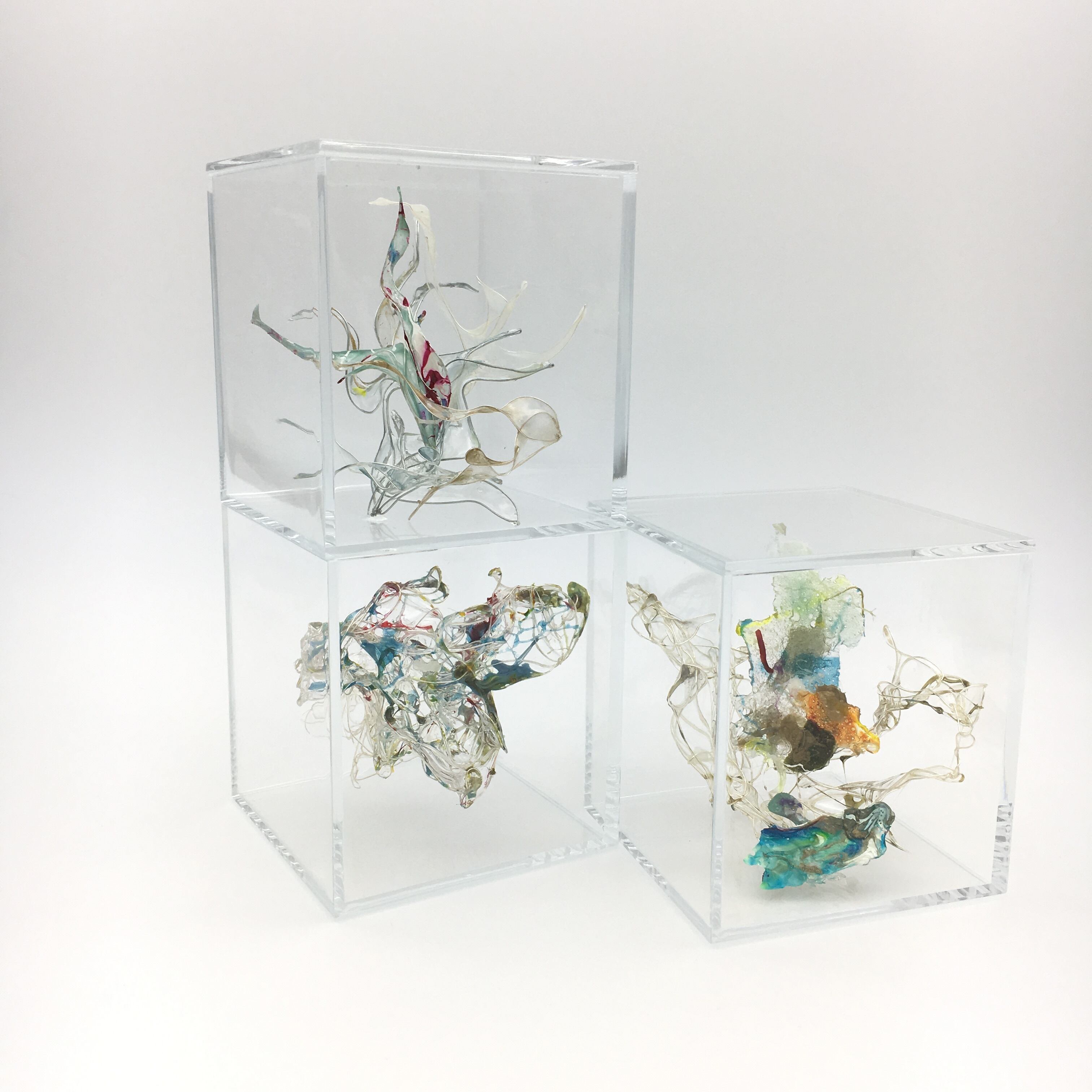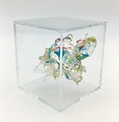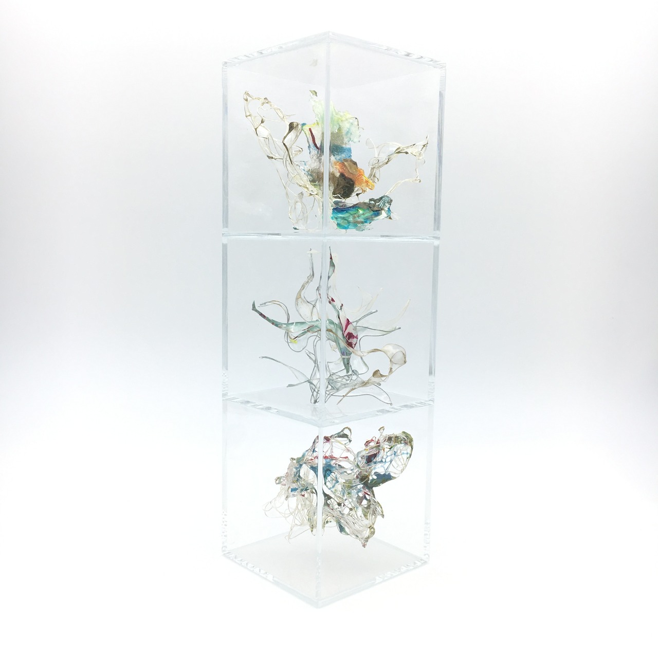 人の眼は見えるものにとらわれてしまいます。ですが何も存在していないと思い込んでいる透明な背景にこそ、何か大切な現象がうごめいている。標本になった心の細胞をイメージした作品。