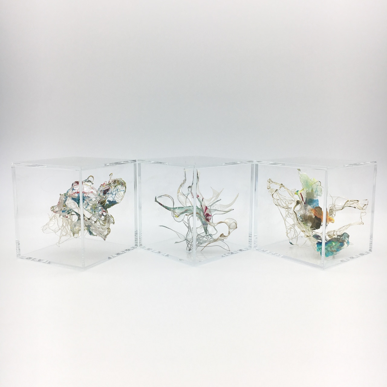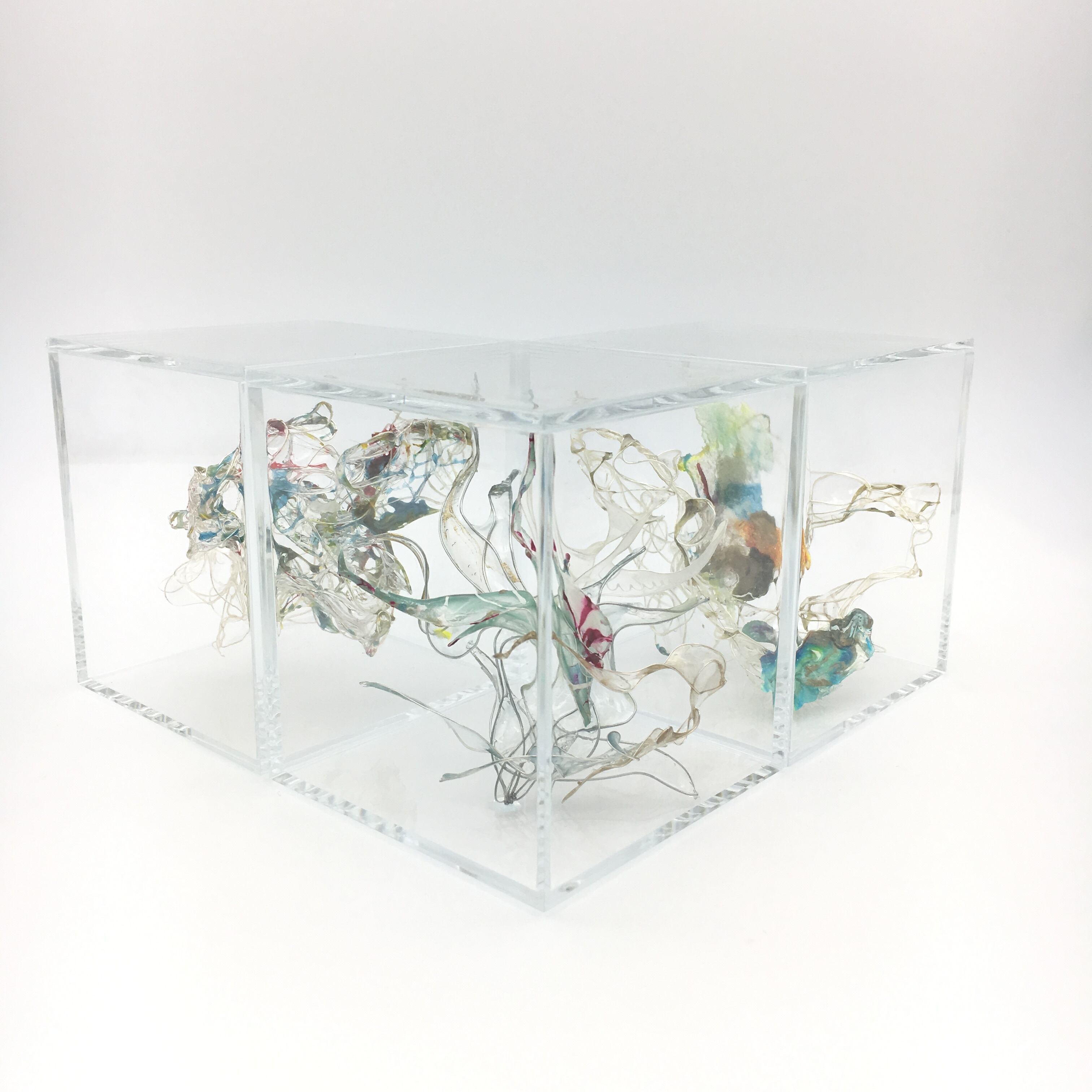 人の眼は見えるものにとらわれてしまいます。ですが何も存在していないと思い込んでいる透明な背景にこそ、何か大切な現象がうごめいている。標本になった心の細胞をイメージした作品。